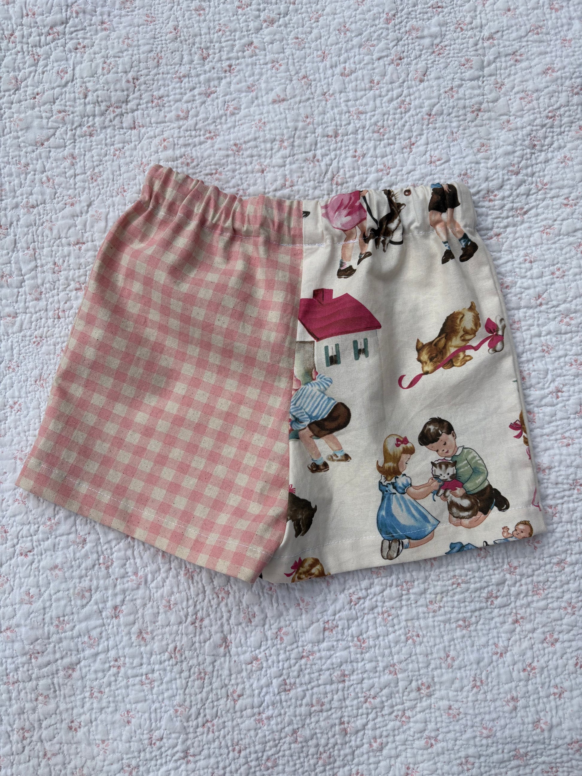 These mix print shorts are made using a vintage looking cotton with cutesy kids, cats and dogs! 100% organic cotton pink gingham and a front pocket for collecting treasures.
