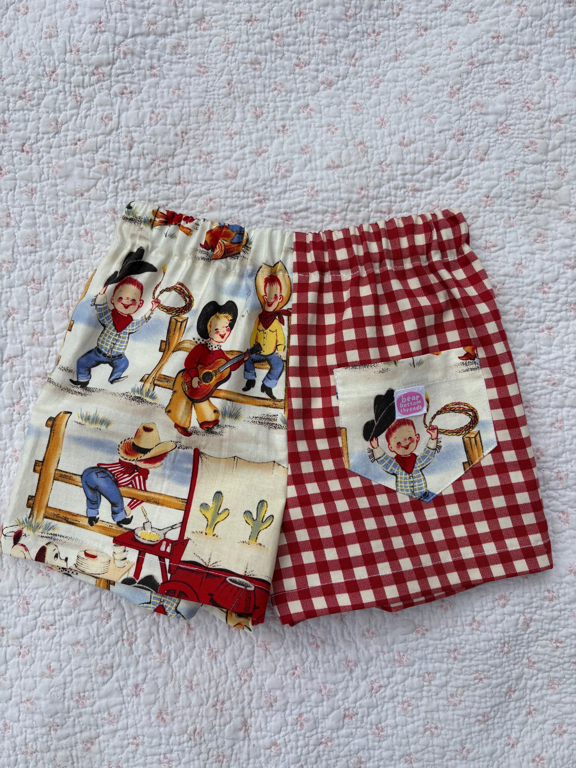 These mix print shorts are made using a vintage looking cotton with cheeky cowboys and red cotton gingham. Front pocket for collecting treasures on your little adventure.
